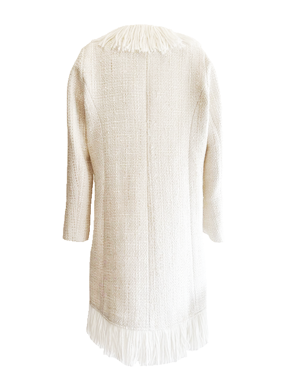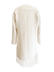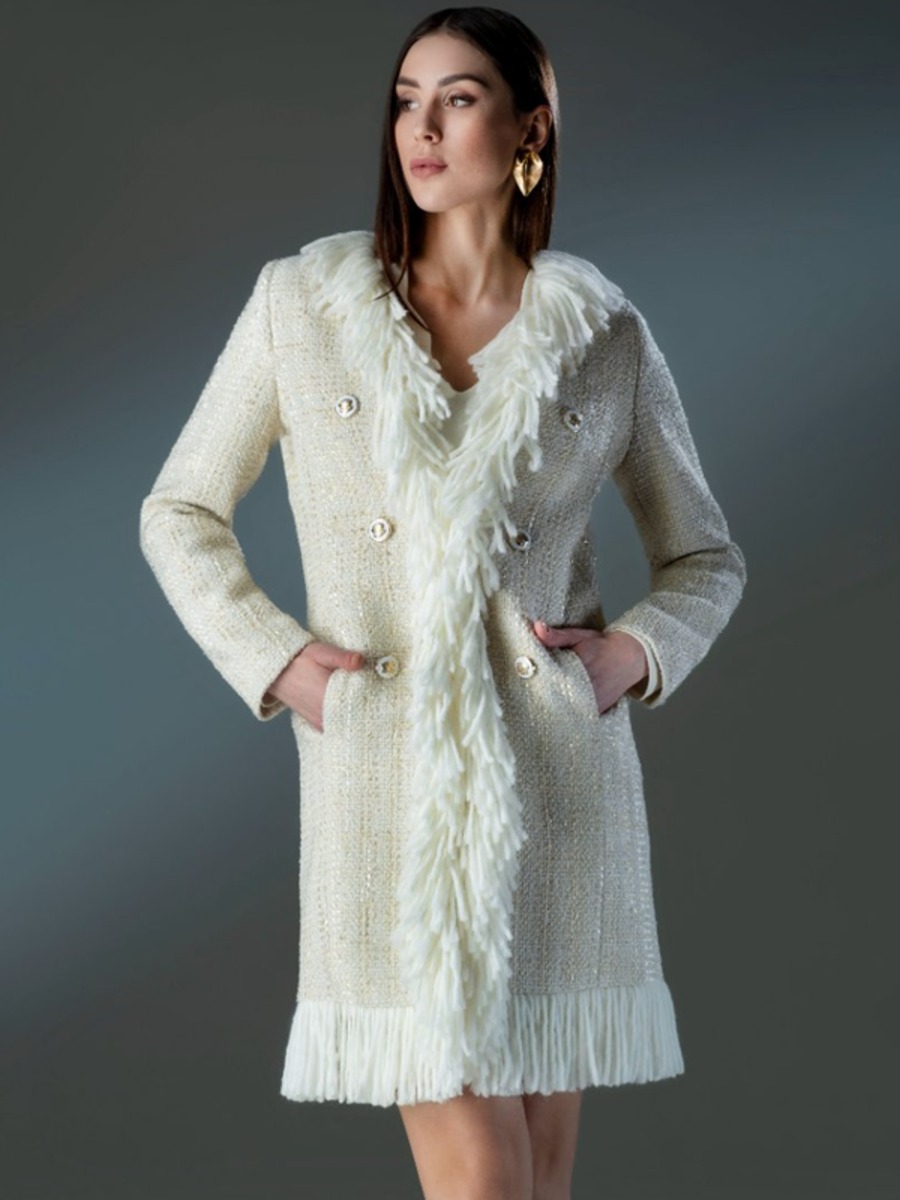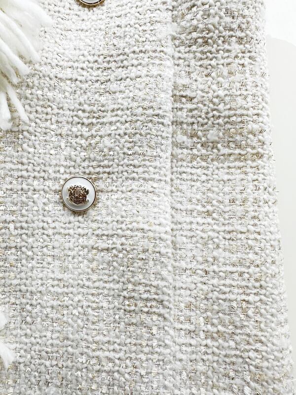 リボンを織り込み、奥行きのある表情を生み出した生地感。フリンジディテールは動くたびに表情を添える華やかなアクセントに。ウエストラインのあるシルエットが女性らしさを引き立ててくれるアイテム。