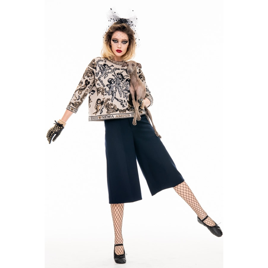 天使が織り込まれ愛らしさと存在感のあるニット。シックなカラートーンにラメが織り込まれリッチさを演出。オーバーサイズシルエットがこなれた印象に。今年は柄物アイテムを合わせて上級者に決めたい!